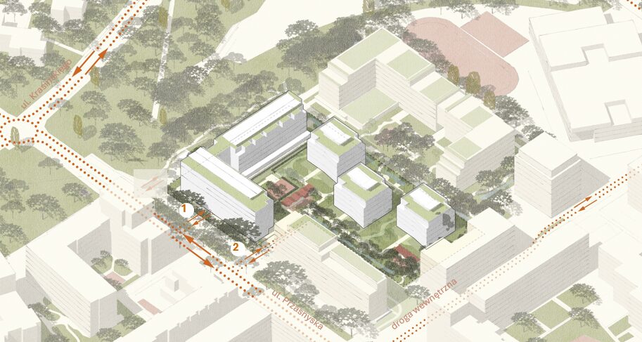Na terenie działki 50/2 z obrębu 7-03-04 przy ulicy Przasnyskiej 6, znajdującej się w południowo-zachodniej części Żoliborza, stanowiącej oś dawnych terenów przemysłowych, planowany jest zespół zabudowy mieszkaniowej wielorodzinnej z usługami wraz z lokalem oświatowym. Inwestycja będzie harmonijnie wpisywać się charakter nowoczesnej zabudowy Żoliborza Południowego. Planowana jest zabudowa obrzeżna, kształtująca pierzeję ulicy, i tereny o charakterze parkowym. Wewnątrz kwartału planujemy punktowe bryły naziemne, stanowiące wnętrzne urbanistyczne z urządzoną zielenią, placem zabaw i terenem rekreacji.